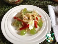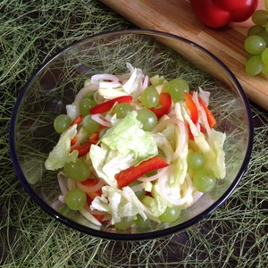 Описание: В настоящее время для приготовления салатов, плова, соуса и каш используют белый виноград. Он имеет выраженные кисло-сладкие нотки. В его кожице содержится меньшее количество сахара по сравнению с другими сортах. Именно поэтому его можно смело кушать тем, кто придерживается диеты или здорового режима питания. Сегодня я предлагаю приготовить этот любимый салат моей семьи. Готовлю его часто и всегда этот нежный, ароматный и аппетитный салат съедается на ура.