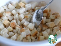 Белый хлеб нарезать на средние кусочки. Выкладываем в миску и смочим бульоном. Можно бульон заменить на воду. |