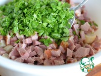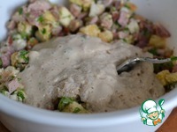 К хлебу добавляем нарезанное мясо. Добавить соль, перец, муку и нарезанную петрушку. Перемешать. |