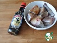 Рыбу чистим, режем на крупные куски, посыпаем свежемолотой смесью перцев, поливаем соевым соусом, у меня соус ТМ Kikkoman. |