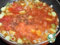Кладём порезанный кубиками картофель и порезанные пополам оливки. У меня попались фаршированные жгучим перцем. Обжариваем овощи ещё 2 минуты. |