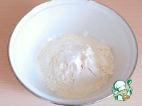 В миске соединить сухие ингредиенты: муку (2,5 стакана), соль (1/2 ч. ложки), соду для выпечки (1 ч. ложка без горки). Смесь размешать. |