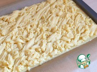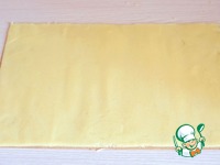 Тесто разделить на две равные части. На пекарскую бумагу выложить одну часть теста, раскатать в пласт толщиной 0,5 - 0,7 см. Перенести пекарскую бумагу вместе с раскатанным тестом на пекарский лист. |