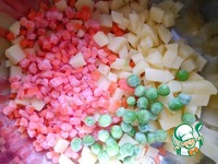 Морковь и картофель нарезаем кубиками, добавляем горошек, заливаем водой, доводим до кипения и варим 10 минут. |