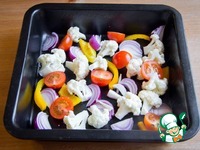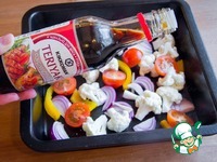 Сбрызнуть овощи соусом терияки и оливковым маслом. Поставить в разогретую до 180С духовку на 25-30 минут. |