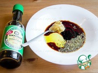 Пока овощи запекаются подготовим маринад для шашлычков. В миске смешаем соевый соус, лимонный сок, оливковое мало, горчицу, бальзамик и травы. |