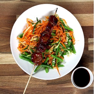 Салат из овощей выложить на тарелку, добавить соус к салату и перемешать, сверху положить свинину на шпажке.