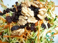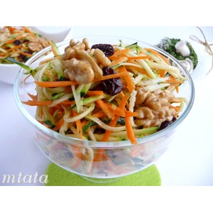 Описание: Предлагаю рецепт салата из цуккини, моркови, грецких орехов и изюма. Салат легкий, полезный, витаминный. Автору рецепта Ольги Кривошеиной огромное спасибо. Я немного измененила рецепт.