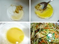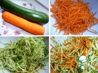Цуккини и морковь натереть на мелкой китайской терке, слегка перемешать с помощью вилок, добавить красный жгучий перец. |