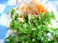 Петрушку (в оригинале должна быть кинза, но у нас ее нет, поэтому взяла петрушку и немного кориандра) измельчить и добавить к луку с чесноком. |