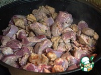 Индейку сначала слегка обжарить на сковородке, переложить в казан или кастрюлю. |