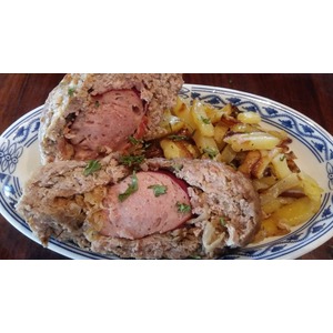 Мясной рулет прекрасно сочетается с жаренной картошкой! Для любителей и бокальчик пива не будет лишним. |