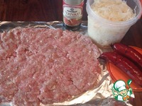 Можно приступать к сборке рулета. На фольгу выложить слой фарша, на него слой капусты, по центру уложить сардельки. Сформировать рулет. |