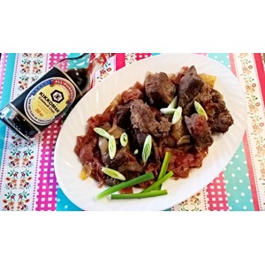 Соевый соус Kikkoman смешать с водой и жидким дымом Добавить лук, перец и помидоры Варить на медленном огне 10-15 минут |