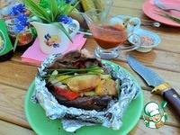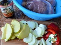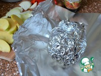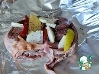 На кусок фольги выложить сердце, на нем распределить кусочки перца, яблока и лука. Поперчить, влить 1 ст. л. маринада от маринования. Свернуть сердце в первоначальный вид. |