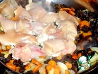 Нарезала на крупные кусочки курицу, положила их в сковороду к овощам и грибам. Всё вместе обжарила. |