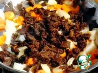Туда же положила вымоченные, нарезанные грибы и продолжила жарить. |