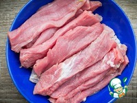 Для этого рецепта прекрасно подойдет нежная часть свинины, такая как вырезка. Нарезаем ее длинными прямоугольниками довольно тонко. |
