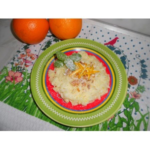 Выложить рис на тарелку, посыпать измельченным миндалем, украсить полосками апельсиновой цедры, веточкой мяты и посыпать сахарной пудрой. |