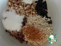 Смешать хлопья, сахар, корицу, мускатный орех, разрыхлитель и подготовленные сухофрукты. |