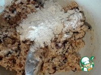 Изюм (у меня в этот раз был чернослив) замочить, а после-порезать. Финики также порезать, предварительно удалив косточки, если таковые имеются. Грецкий орех порубить (на ваш вкус: можно мелко, а можно крупно, а можно оставить целые орешки и вложить внутрь печеньки или положить сверху). Вообще можно использовать и кунжут, цукаты, семена льна, семечки подсолнечника и т. д. и т. п..
