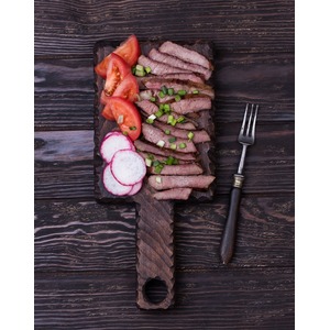 Снять стейки с огня и дать отдохнуть минут 5-7. Затем тонко нарезать, посыпать зеленым луком и крупной морской солью. Подавать со свежими овощами. |