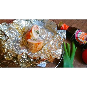 Бочонки помещаем на куски свинины. "Стейки" скручиваем в рулеты, помещаем каждый в фольгу, а затем - на гриль. |
