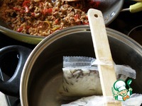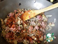 Выложили фарш, посыпали паприкой и, помешивая, обжариваем, разбивая комочки, до рассыпчатости фарша. Добавляем сладкий перец и прогреваем его. |