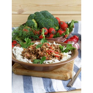 Выкладываем рис по тарелкам, в середину кладем фарш с овощами. И сразу подаем, украсив зеленью. Ароматный и сочный обед готов! |