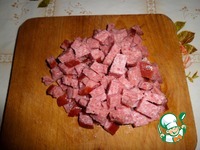 Нарезаем кубиком копченую колбасу. |
