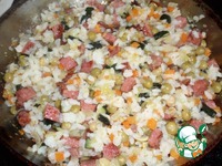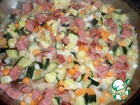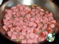 На разогретую сковороду наливаем растительное масло. Выкладываем нарезанную колбасу. Обжариваем 2-3 минуты. |