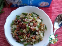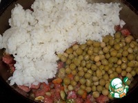 Добавляем в сковороду отваренный рис и консервированный зеленый горошек. Солим. |