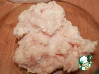 Куриное филе пропустим через мясорубку или измельчим в блендере, посолим. Добавим оставшийся пассерованный лук, перемешаем. |