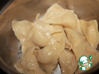 Скрепляем края. Вот такие "ушки" у нас получаются. Из указанного количества муки у меня вышло около 40 штук. Их можно заморозить и отваривать по мере необходимости. |