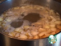 Бульон довести до кипения, опустить в него картофель и лук, добавить перец, убавить огонь до среднего и варить 15 минут. |