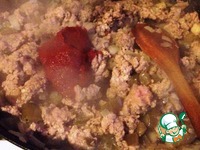 В сотейник добавить фарш. Готовить, разбивая комки, 10-12 минут. Добавить томатную пасту. Перемешать. Готовить ещё 3 минуты. |