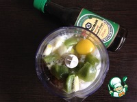 Репчатый лук и киви очистить от кожуры, крупно нарезать. В чашу блендера добавить лук, киви, сырое яйцо, соевый соус. Я использовала натурально сваренный легкий соевый соус ТМ Киккоман. |