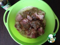 Мясо посолить, добавить специи и приправы для шашлыка, перемешать. В мясо влить маринад, минеральную воду, хорошо перемешать. Убрать в прохладное место мариноваться на 1,5-2 часа. |