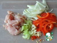 Для приготовления удобно брать вок, если нет, то берём сковороду с толстым дном. На горячую сковороду наливаем растительное и кунжутное масло, кладём порезанную куриную грудку. |