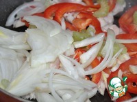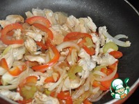 Когда куриная грудка побелеет, кладём сразу все овощи, и обжариваем, помешивая, на среднем огне, около 5 минут. |