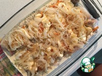У меня была целая большая треска, чистим, срезаем филе ( косточку и ещё кусочек я отрезала, чтобы оставить на крем-суп). В итоге осталось около 1 кг филе. Поливаем в форму масло, укладываем рыбу. |