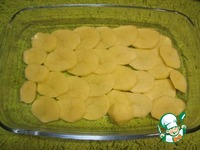 Картофель очищаем от кожуры и нарезаем кружочками. Выкладываем внахлест на дно формы для запекания. В моем случае-это прямоугольная форма 25х35 мм |