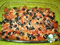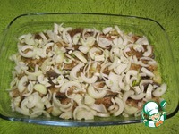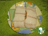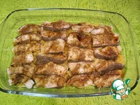 Филе нарезаем прямоугольными плоскими кусочками, начиная с узкого края филе, и укладываем в 1 слой в форму. |