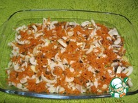 Морковь очищаем от кожуры, трём на крупной тёрке и выкладываем равномерно на лук. |