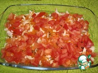 Помидоры режем мелкими кусочками и укладываем равномерно на морковь. |