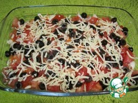 Маслины нарезаем пополам поперёк и укладываем равномерно на помидоры. |