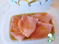 Индейку нарезаем тонко, около 0,5 см. Заливаем маринадом и оставляем на 2 часа. |