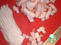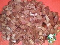 Минут через 5-7, вынимаем печенку из воды, даем ей полежать минут 5 и начинаем нарезать небольшими кубиками. |