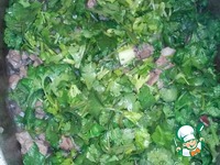 Моем, просушиваем и нарезаем кинзу. Перемешиваем еще раз содержимое нашей кастрюли и добавляем туда кинзу (не перемешиваем). |