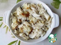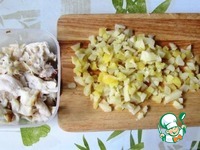 Рыбу разбираем на кусочки. Отварной картофель мелко нарезаем или грубо разминаем толкушкой. |